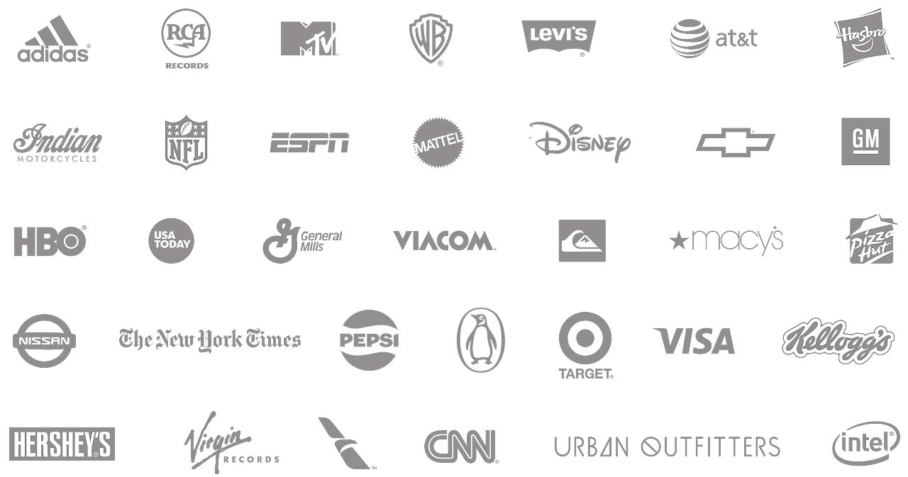 MTV, Disney, HBO, Sony, The National Football League, Sports Illustrated, Lucent, Oracle, Viacom, AT&T, IBM, Target, Hasbro, Mattel, Sears, Nissan, CNN, BBC America, Virgin Records, RCA Records, Adidas, Levi's, Quicksilver, Urban Outfitters, Sega, Pizza Hut, Indian Motorcycles, Best Buy, Pepsi, Hershey’s, Phillip Morris, 3Com, The US Campaign Against Youth Violence, The US Department of National Security, Kellogg’s, General Mills, Nestea, Sonicare, Forbes Magazine, The New York Times, MacWorld Magazine, Capitol One Visa, Honeywell, Seiko, Time, Newsweek, The Wall Street Journal, People Magazine, American Airlines, Southwest Airlines, Miller Lite and Earnest & Julio Gallo Winery.