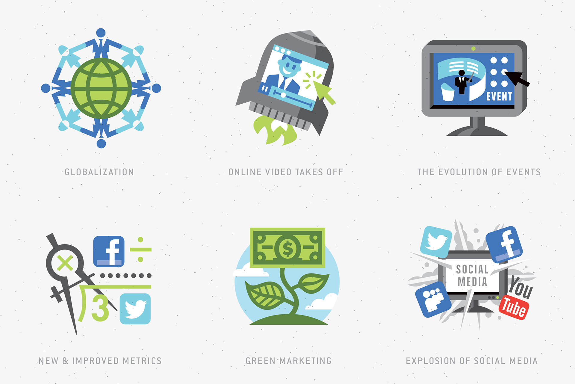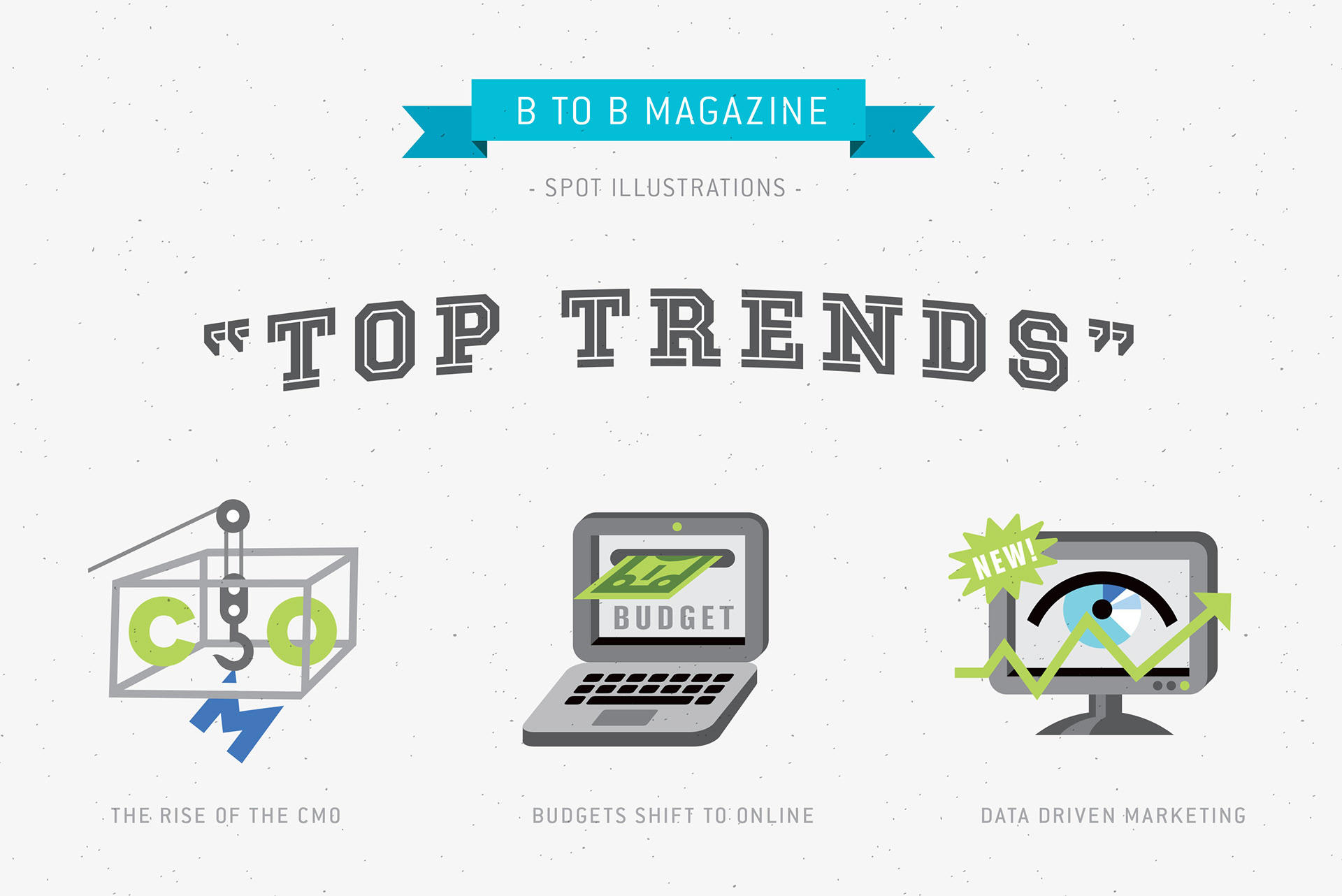 I had the pleasure of creating a series of spot illustrations for B to B Magazine, visualizing the top six business trends of the year.
