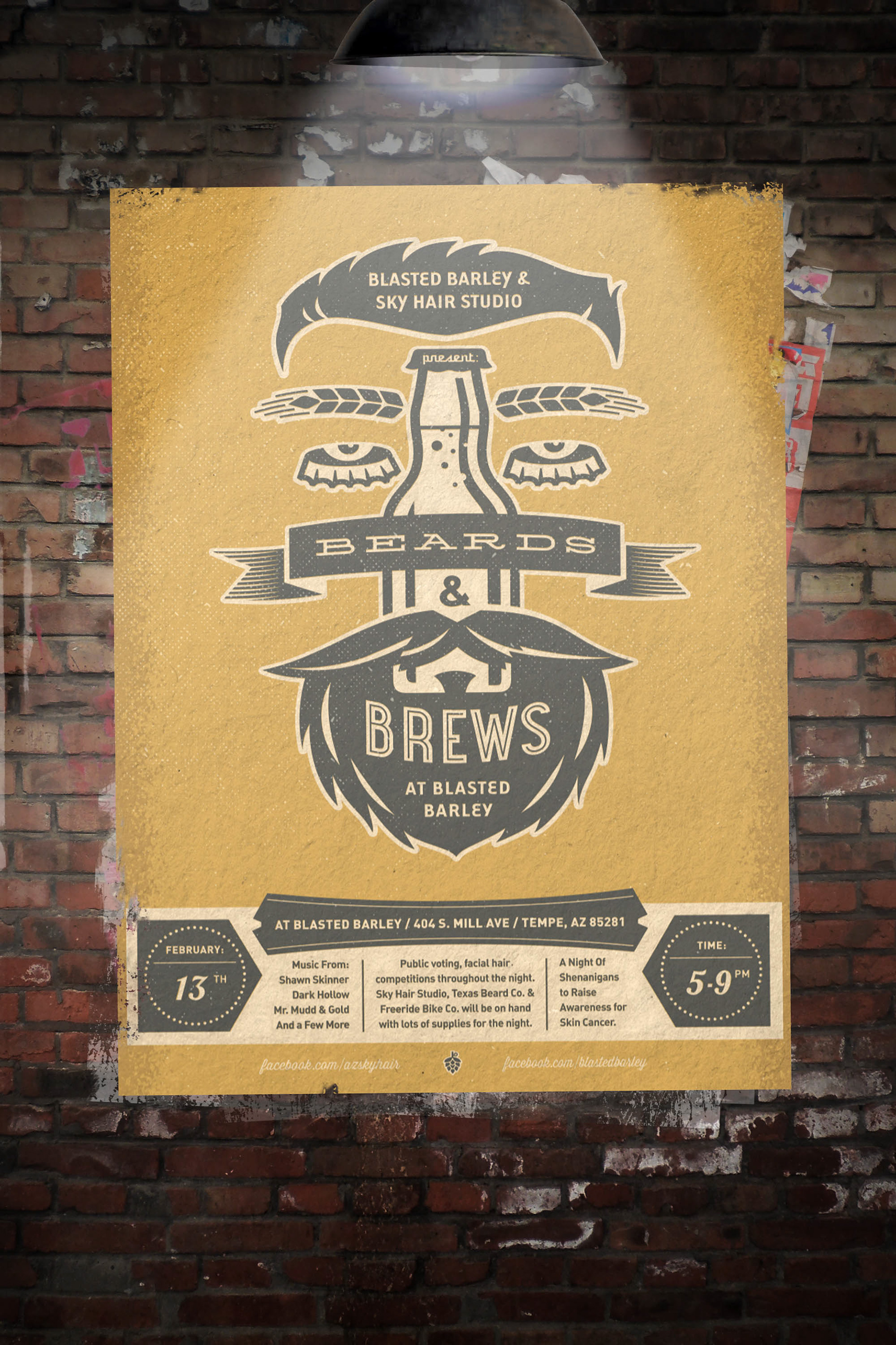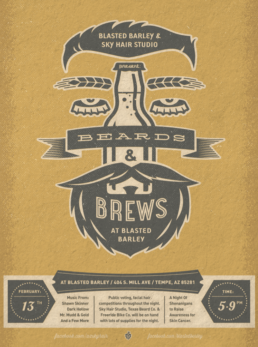 I designed the poster for the “Beards & Brews” event in Tempe, AZ, a celebration of the finest facial hair and craft beer… complete with contests, prizes, and plenty of personality. The design blended vintage barbershop flair with brewery grit to capture the spirit of community, craft, and competition.