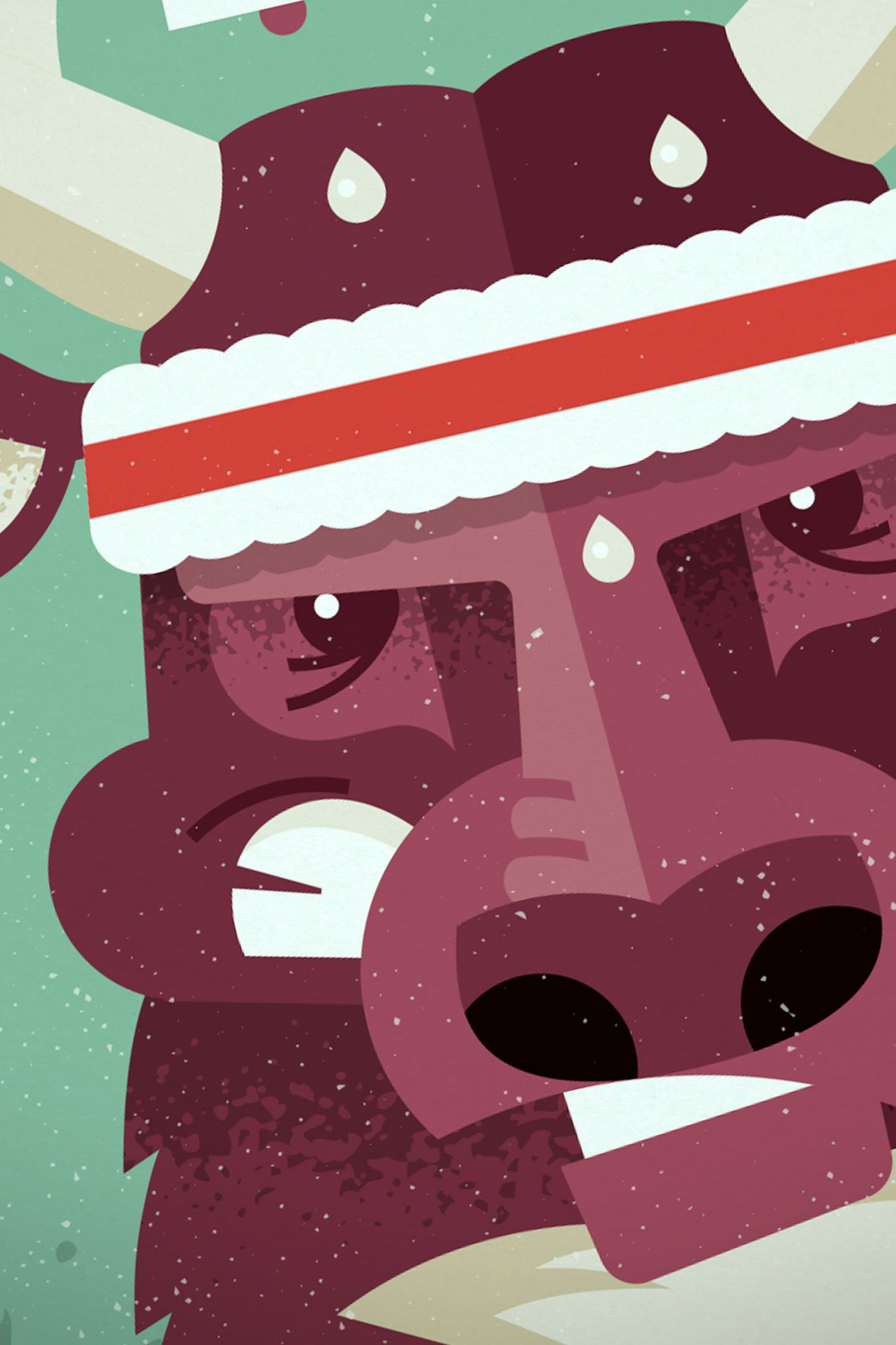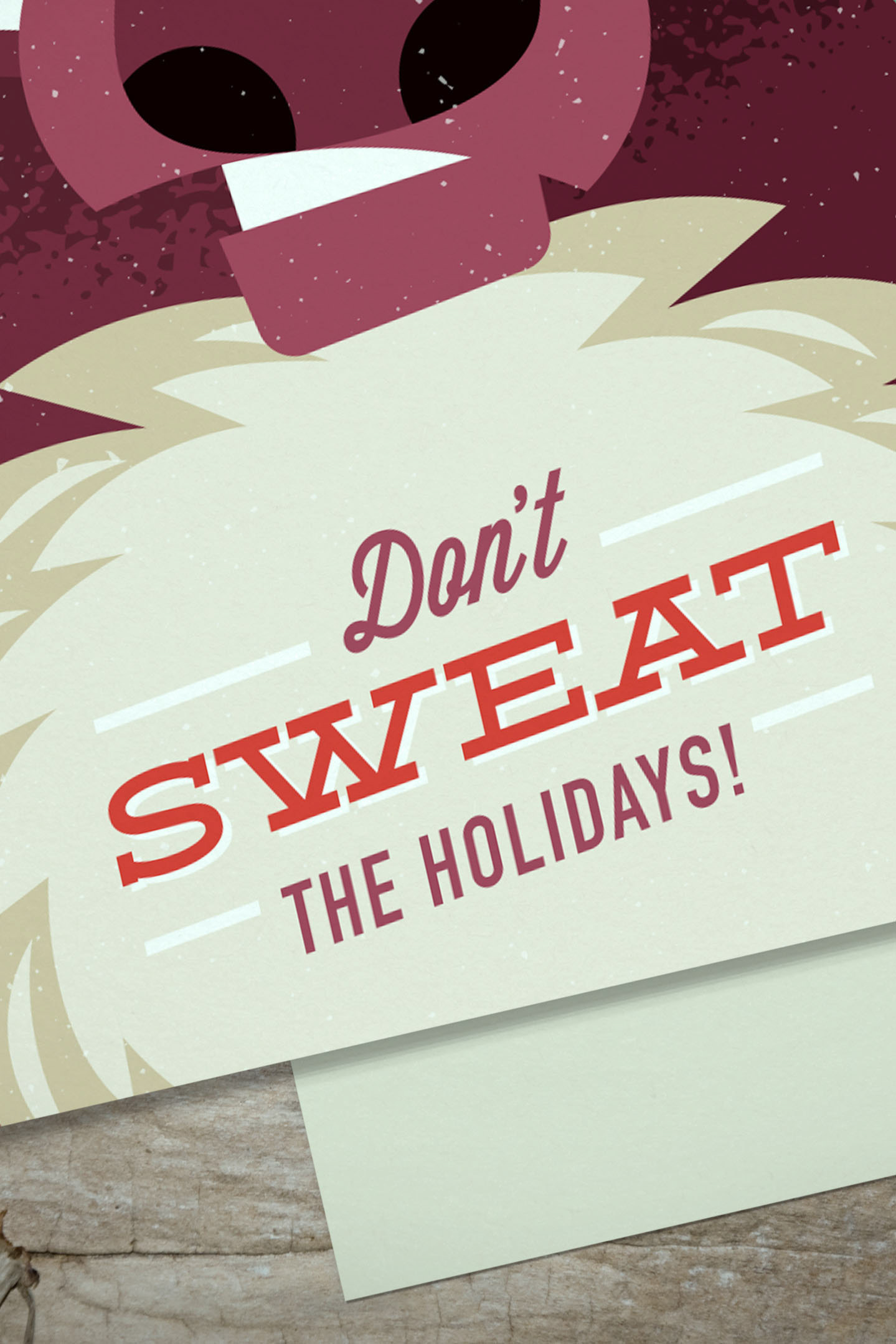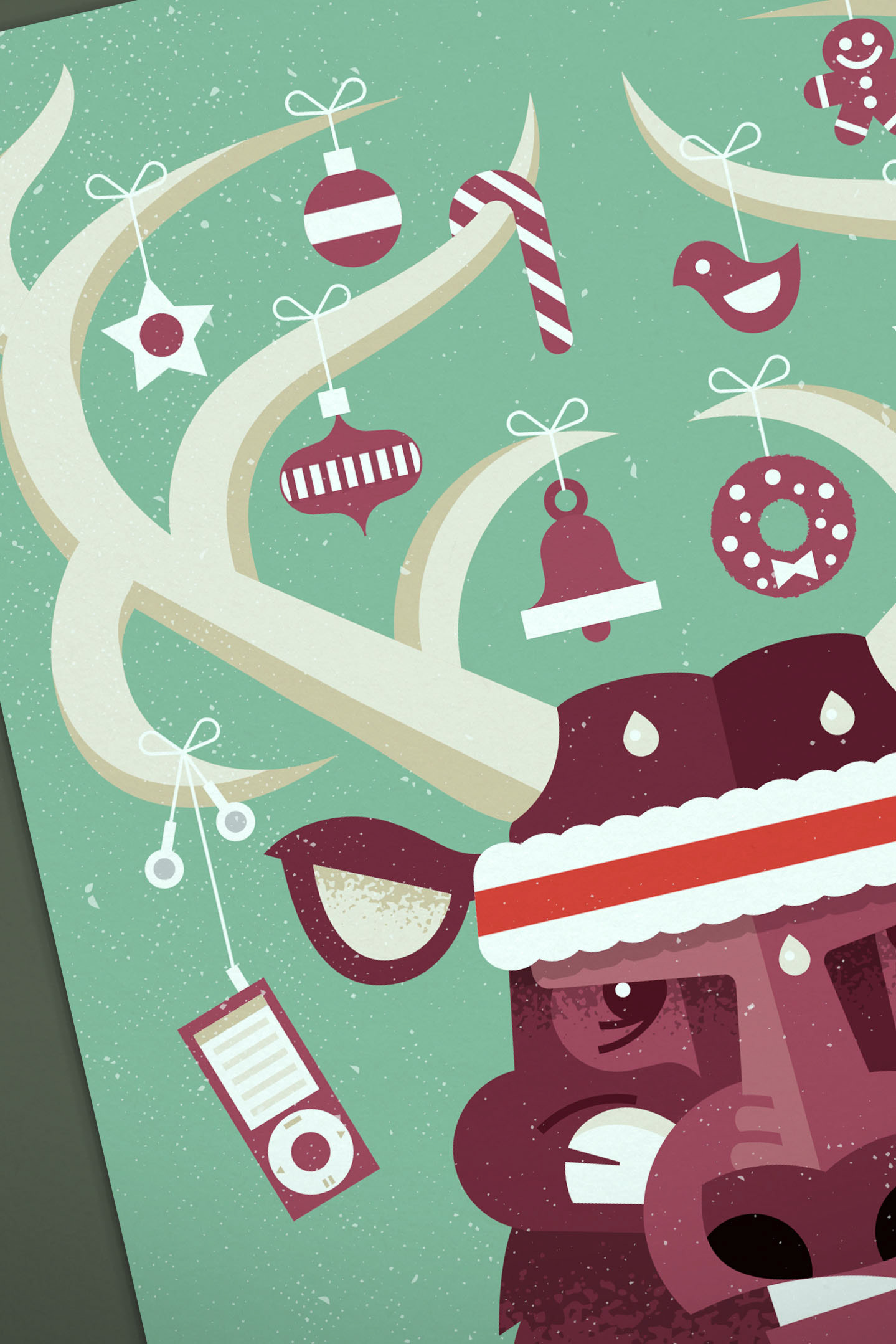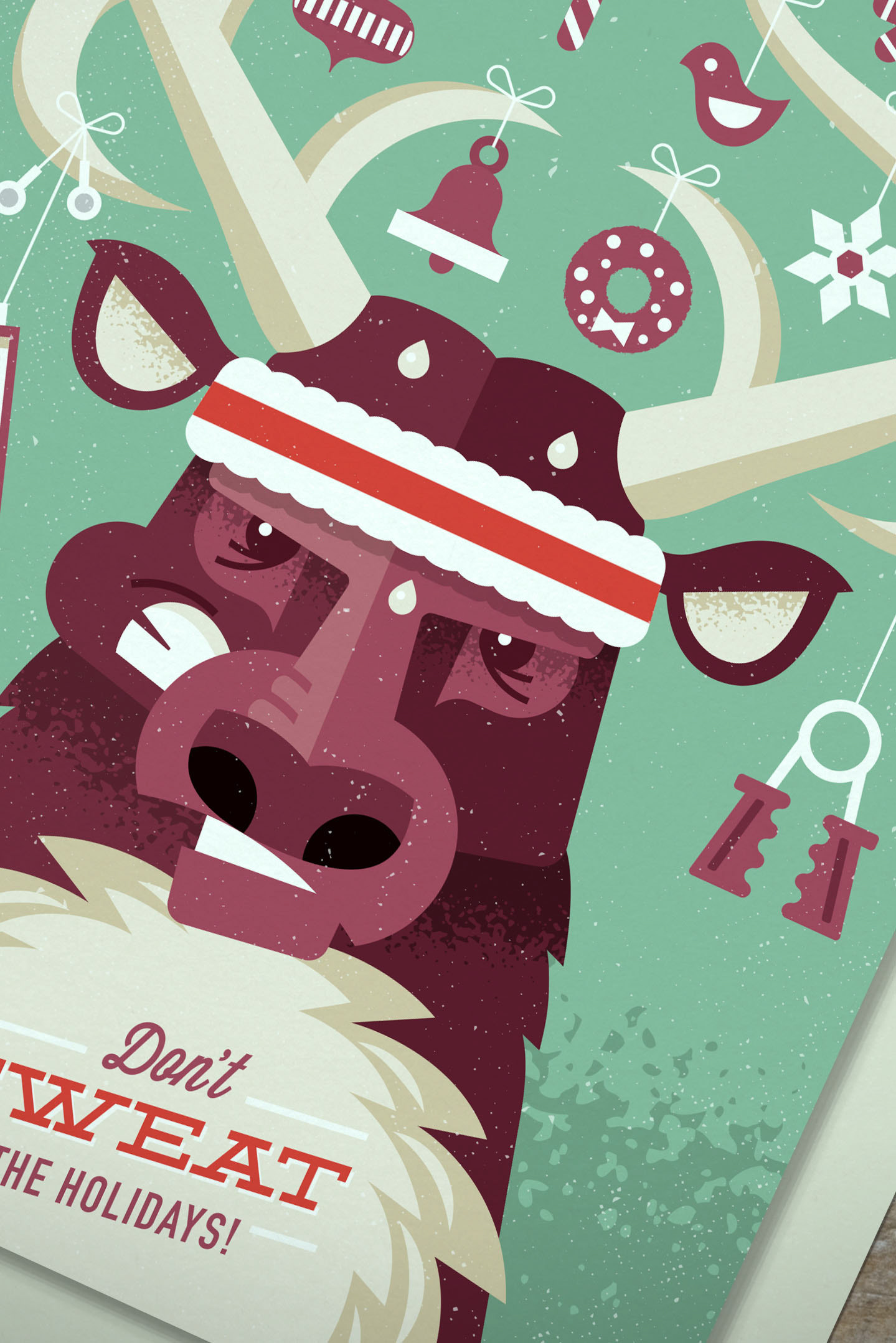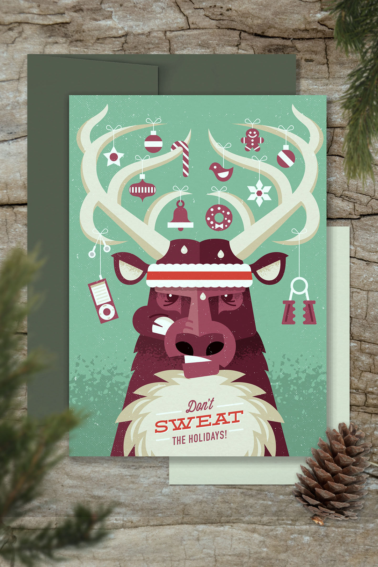 I illustrated a Holiday card for Esser Design in Phoenix, AZ, themed “Don’t Sweat the Holidays.” The concept? A reindeer decked out with a sweatband, juggling traditional gifts hanging from its antlers, because even Santa would break a sweat in an Arizona winter.
